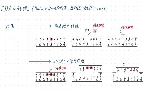 DNAの修復には複製時の修復と二重らせん構造の損傷時の修復の2種類がある 複製時の修復 校正修復 ミスマッチ修復 二重らせん構造の修復 塩基除去修復 ヌクレオチド除去修復 二重らせん構造の修復 ヌクレオチド除去修復はDNAの安定構造である二重らせん構造が…